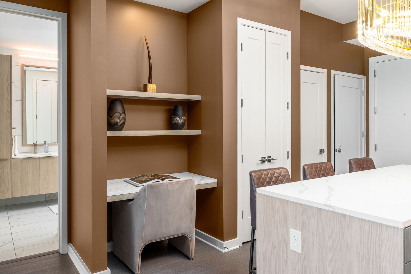 Step into your lavish 880 sq ft., king-size, one-bedroom haven nestled in the vibrant heart of Midtown, Atlanta! This remarkable residence promises opulent comfort, vistas, and convenience, crafted to surpass your every desire. As you enter, discover an expansive waterfall island and a beautiful chandelier, guiding you to a fully equipped kitchen featuring premier appliances effortlessly catering to your culinary desires with grace and style.