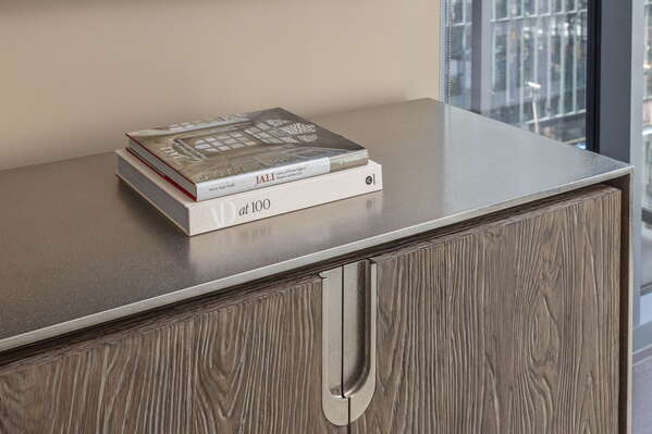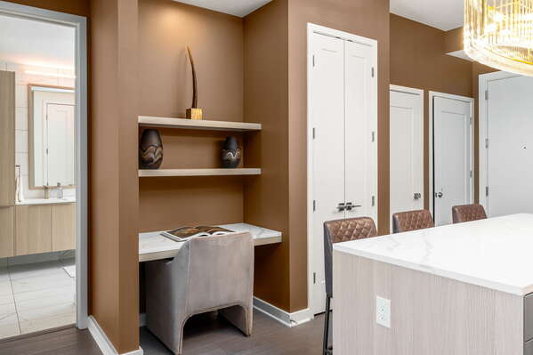 The living area radiates elegance with its gold monochromatic palette, enhanced by cutting-edge 4K UHD TVs, ensuring a cinematic experience. Seamlessly connect with high-speed WIFI across the unit and building, ideal for streaming your preferred films or engaging in work at the designated built-in desk. Relax on your personal balcony adorned with sumptuous seating and city panoramas, or retire to the bedroom where luxury meets allure, complete with a state-of-the-art 4K UHD screen.