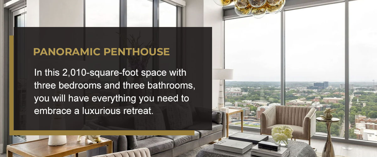 At the Panoramic Penthouse, luxury and comfort are top priorities. In this 2,010-square-foot space with three bedrooms and three bathrooms, you will have everything you need to embrace a luxurious retreat. While the design and palette are opulent thanks to details like quartz waterfall countertops, this space does not neglect comfort. The residence features two king master bedrooms and one queen guest bedroom decorated with soft tones so you can enjoy a restful stay.