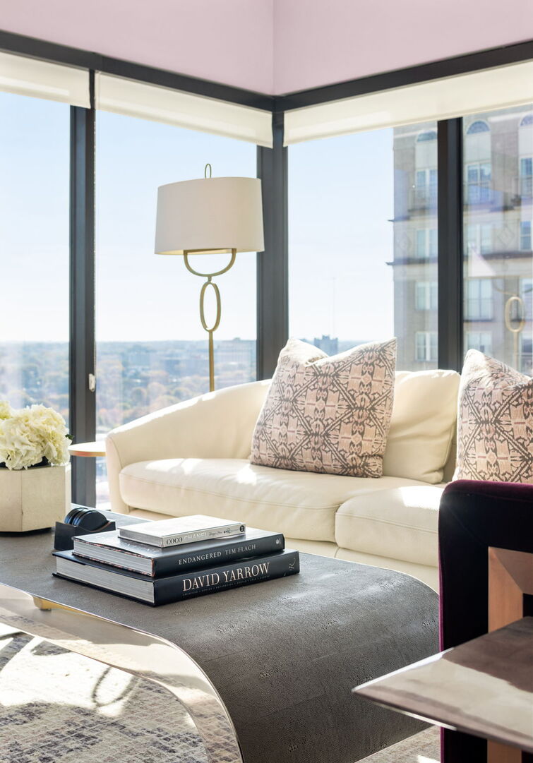 A four-person dining room table is ideal for enjoying a meal with a view while additional bar stool seating is found in the kitchen that also hosts stainless steel appliances and a sleek backsplash to pull the color theme together. The walls throughout this space are contrasted with sleek white cabinets, keeping the interior design seamless and stylish.
